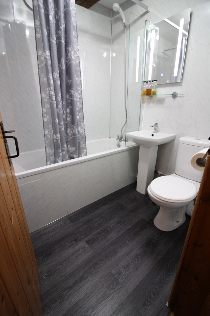 Fully fitted tiled bathroom, with WC, Washbasin, Full size bath with shower over.